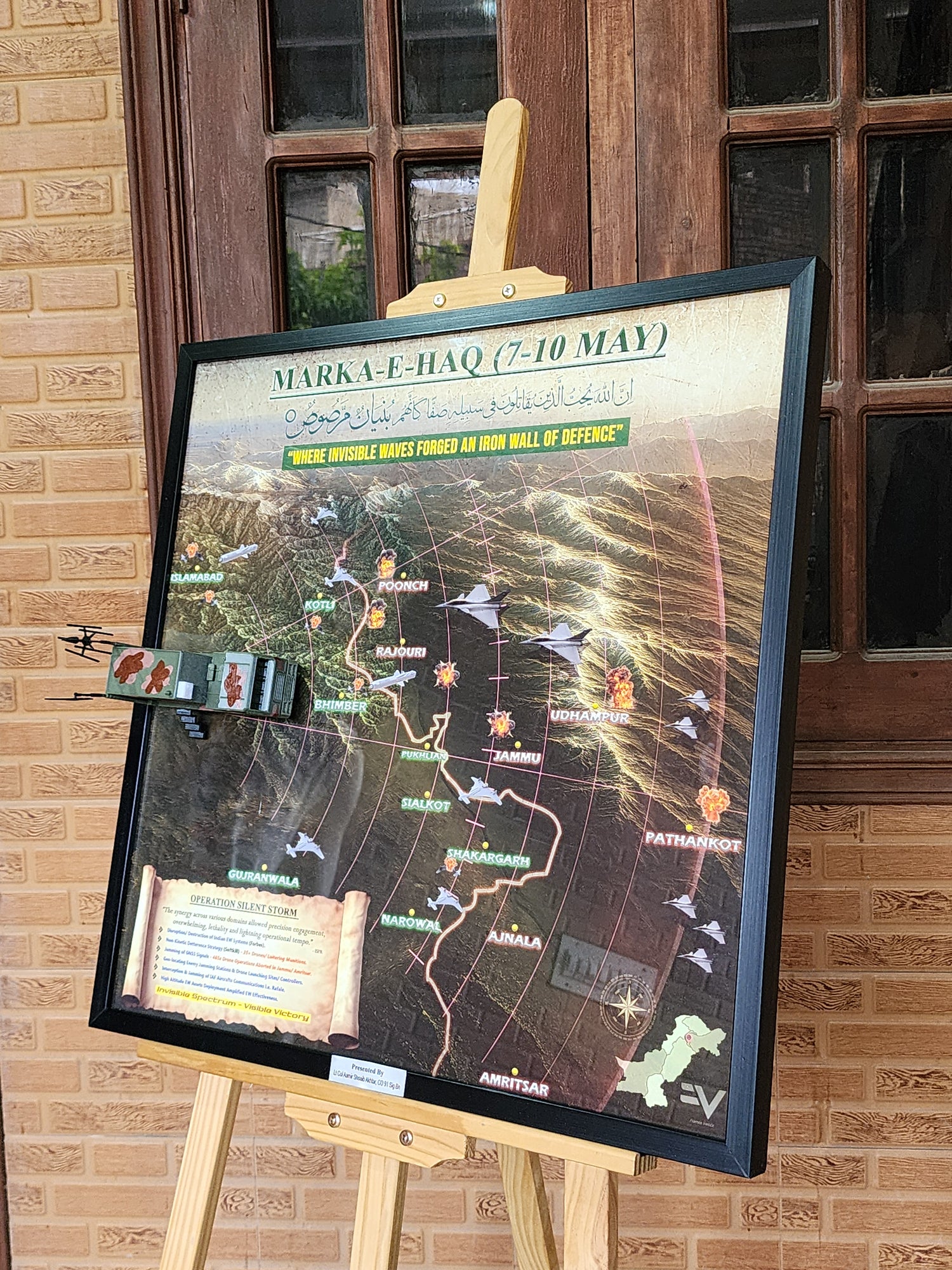 A powerful tribute to modern electronic warfare, this large-format display recreates the critical moments of the 9th May battlefield scenario—when advanced EW systems disrupted hostile drones and fighter communication using a dedicated EW truck. Built as a museum-grade visual piece, it combines a custom battlefield poster with a precisely crafted 8-inch EW vehicle model mounted in dynamic 3D.