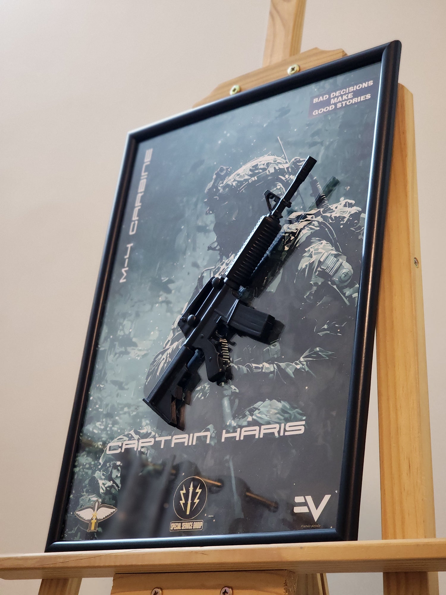 A bold, modern display piece designed for collectors and enthusiasts of tactical design. This frame features a precisely crafted 10-inch 3D-printed rifle model, mounted in a dynamic angled position that adds depth and realism. Set against a gritty, action-inspired poster and enclosed in an elegant 18 × 12-inch frame, the presentation delivers a striking visual impact.