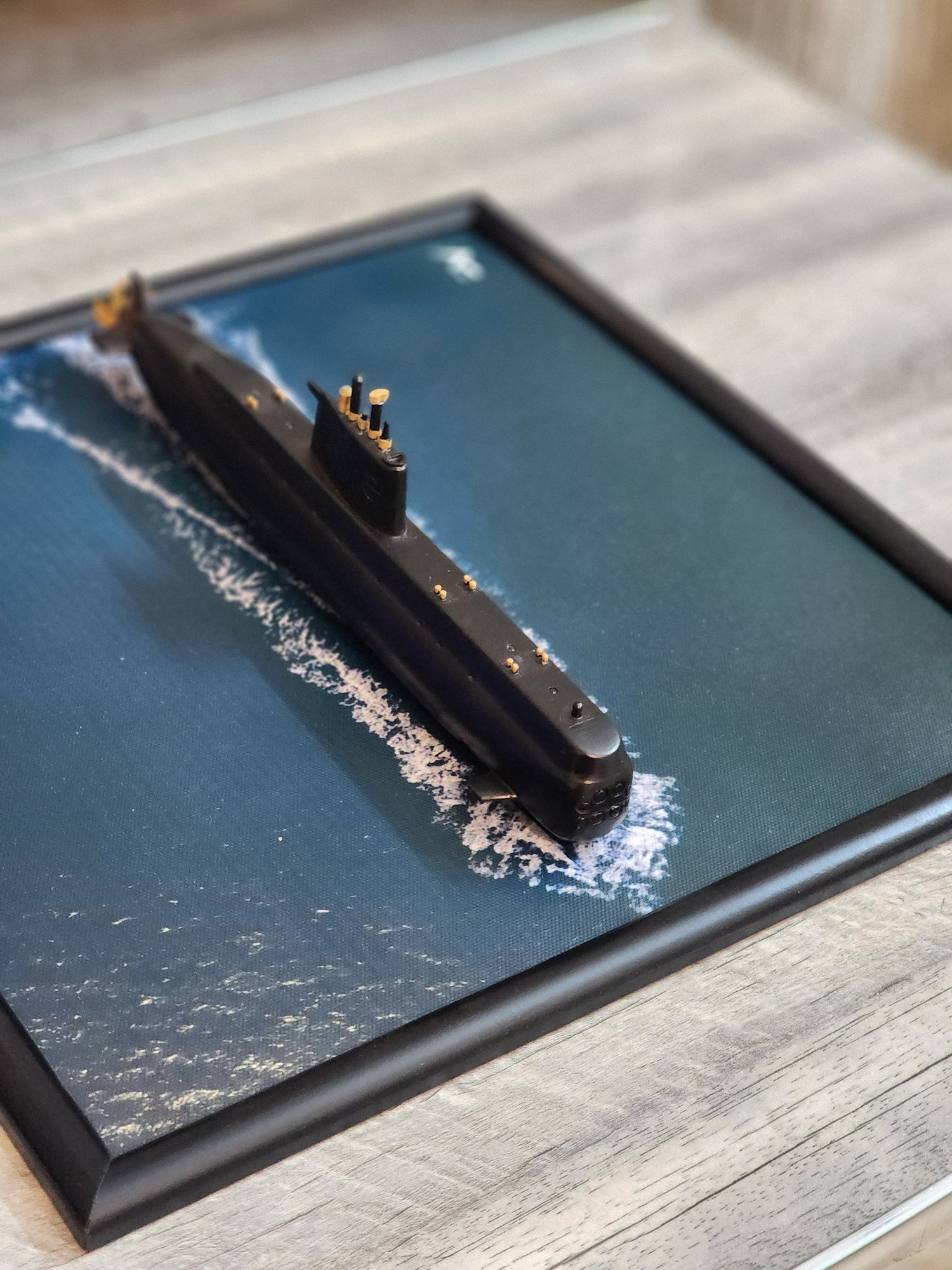 A striking tribute to undersea warfare, this display features a meticulously crafted 10-inch submarine model mounted in a dynamic ocean-themed scene. Designed to convey stealth, power, and precision, the submarine appears to cut through open waters, brought to life by textured wave detailing and a deep maritime color palette. Encased in a clean, modern 1 ft × 1 ft frame, this piece delivers a bold yet refined presence.