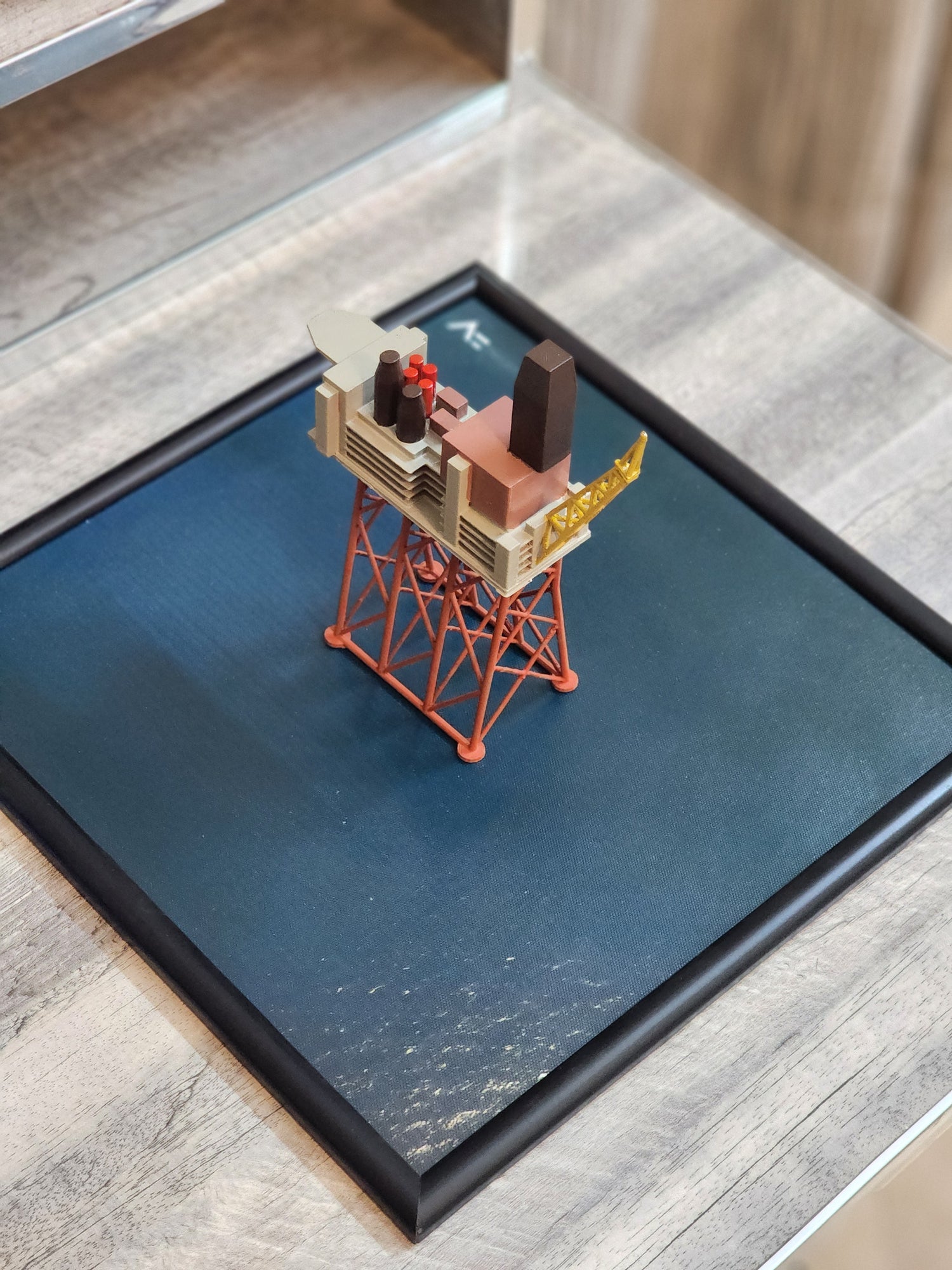 A detailed representation of offshore engineering excellence, this display features a fully 3D-printed oil rig model mounted within a refined 1 ft × 1 ft frame. Designed to highlight the complexity and scale of offshore energy infrastructure, the rig showcases layered platforms, structural supports, and industrial detailing that bring the scene to life.