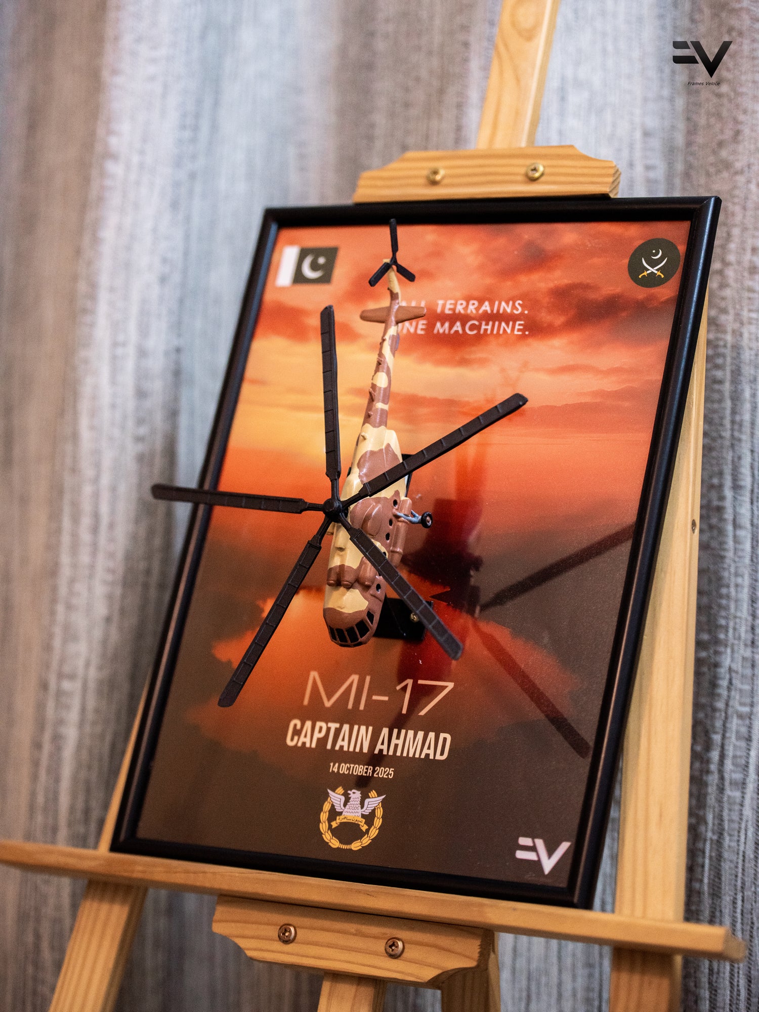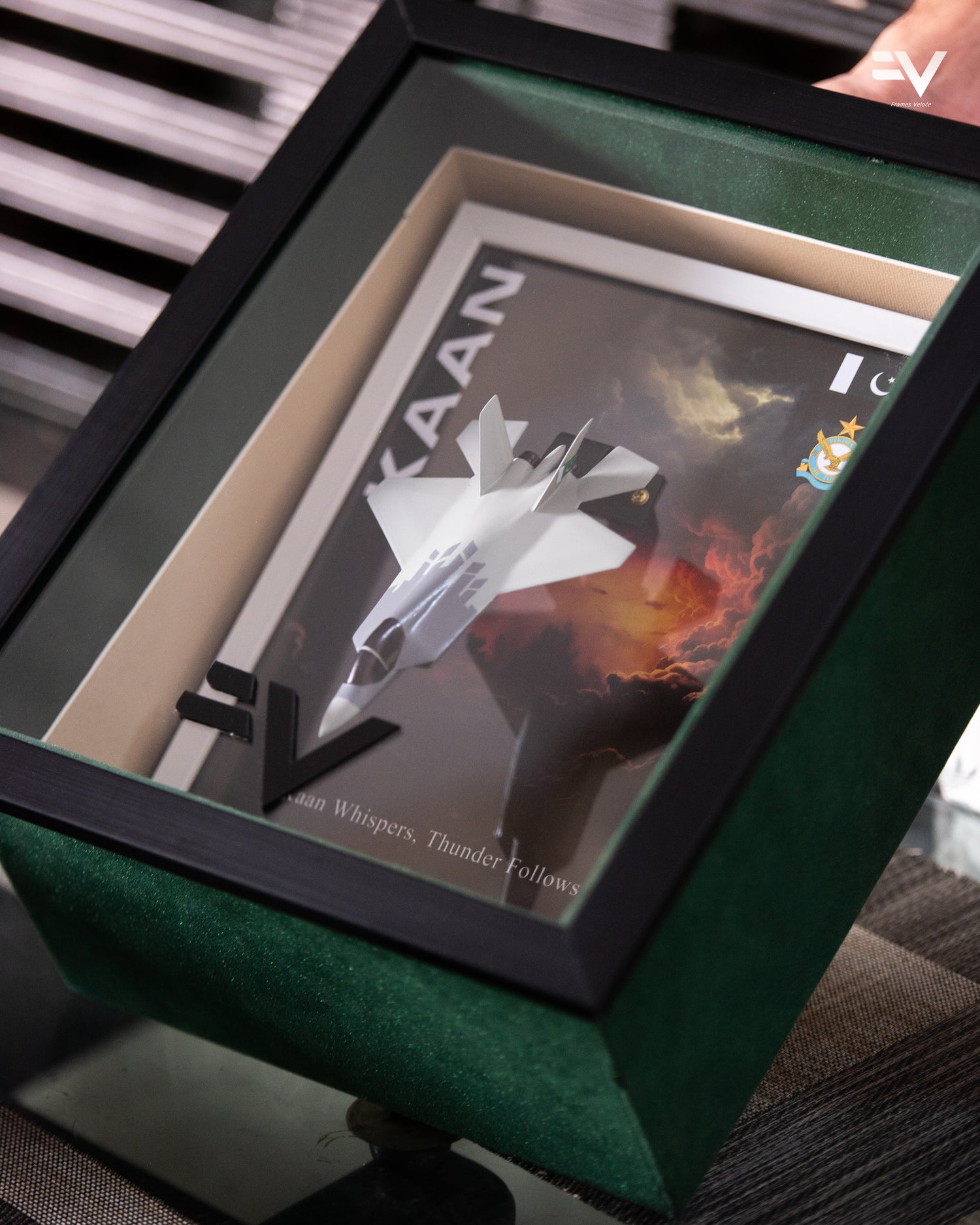 A tribute to next-generation aviation, this TF-KAAN display piece combines precision modeling with luxury presentation. Featuring a finely crafted 3D-printed jet set against a dramatic storm-sky poster, the display captures the stealth, power, and futuristic presence of the KAAN program. Housed inside a custom-built velvet presentation box, this masterpiece is crafted exclusively for AVM Aurangzeb, PAF, reflecting the prestige and excellence of Pakistan’s aviation legacy.