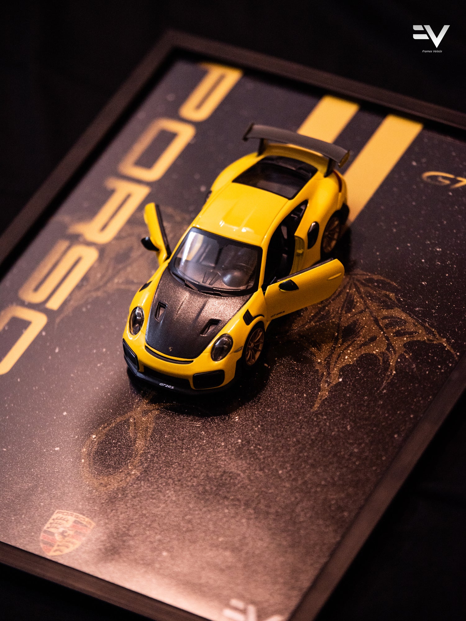 The Porsche 911 GT2 RS the pinnacle of precision and performance, captured in stunning detail. This 7-inch model, finished in Racing Yellow, stands boldly against a striking black poster featuring a fierce yellow dragon a symbol of power, speed, and dominance. Framed in a sleek, modern border, it embodies the perfect harmony of art and engineering.