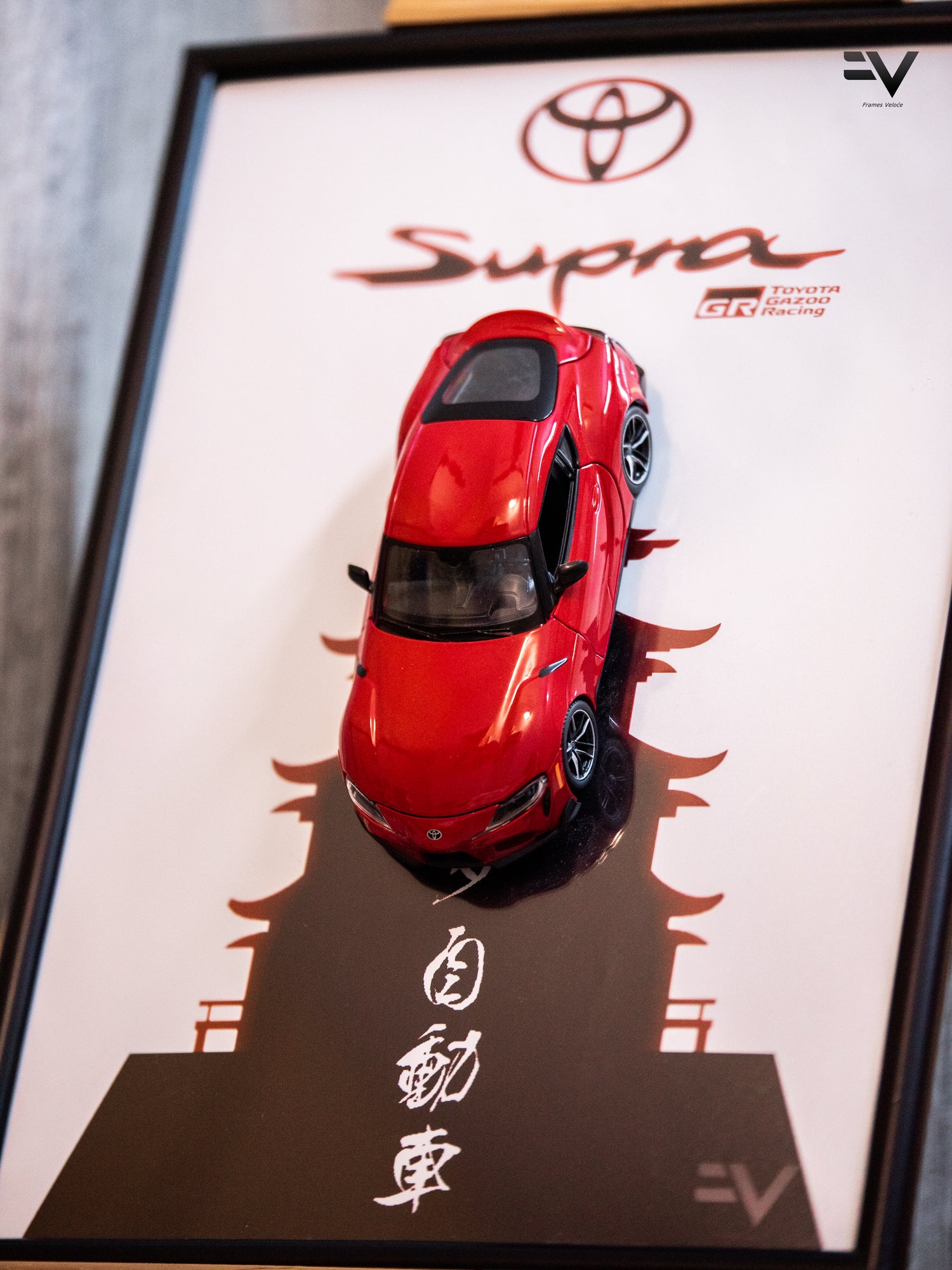 A tribute to Japanese performance heritage, this Toyota GR Supra model is presented in a vivid red finish, mounted against a striking, culturally inspired backdrop. The 8-inch model is elevated on a clean, modern frame, blending motorsport energy with artistic expression. With its bold silhouette and refined presentation, this piece captures the spirit of Toyota’s legendary sports icon.