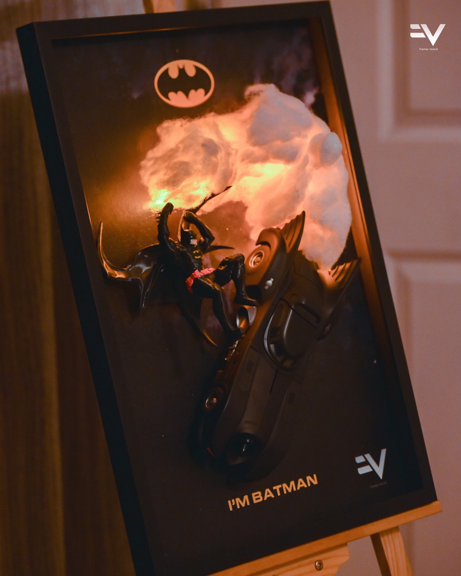 A masterpiece designed for true Dark Knight enthusiasts. This dynamic 3D display combines a high-resolution 3D-printed 7-inch Batman action figure with an imposing 11-inch Batmobile model—brought together in an explosive, cinematic scene that feels pulled straight from Gotham itself. Housed in a grand 24 × 18-inch frame with integrated LED lighting, this piece radiates atmosphere, drama, and collector-grade craftsmanship.