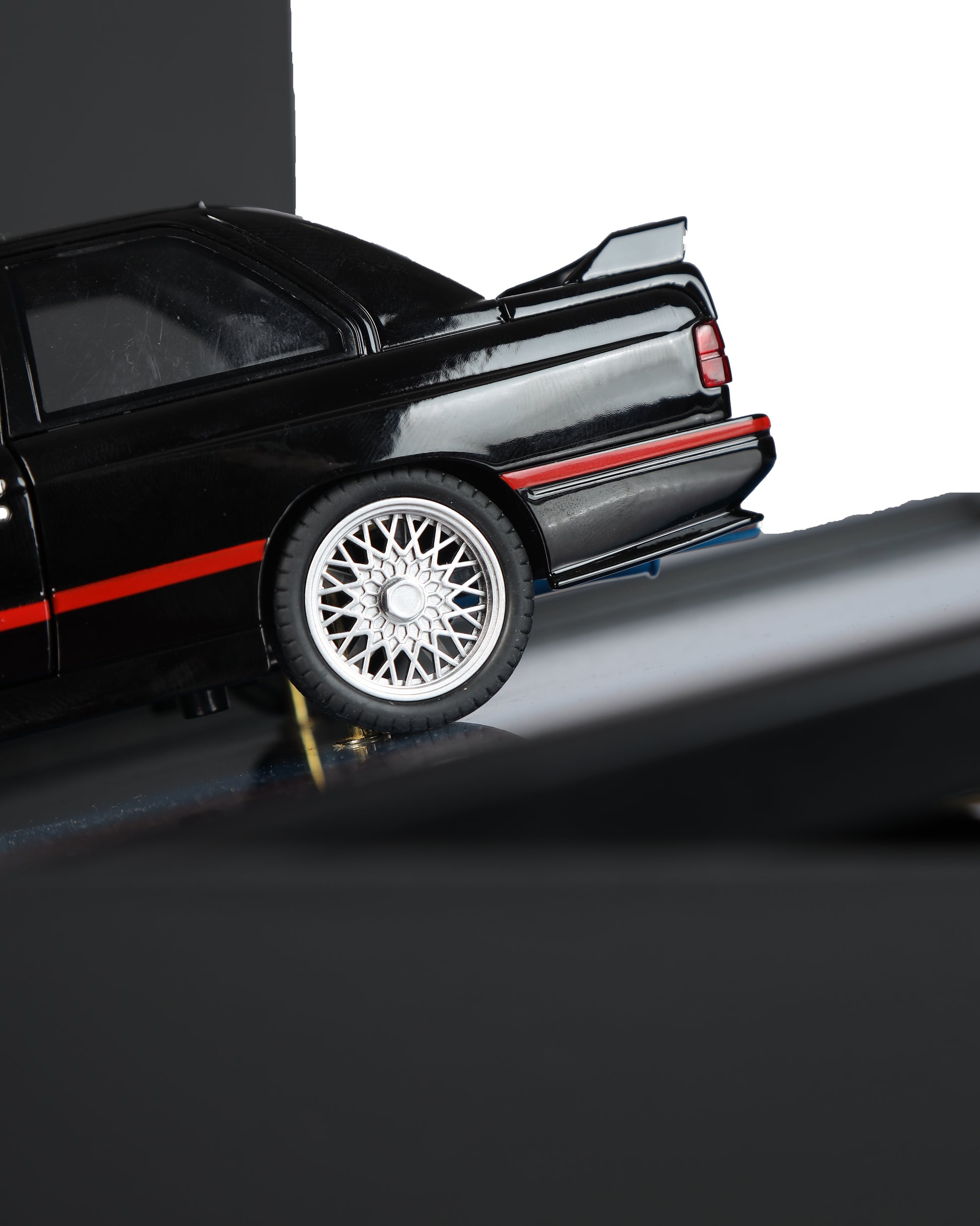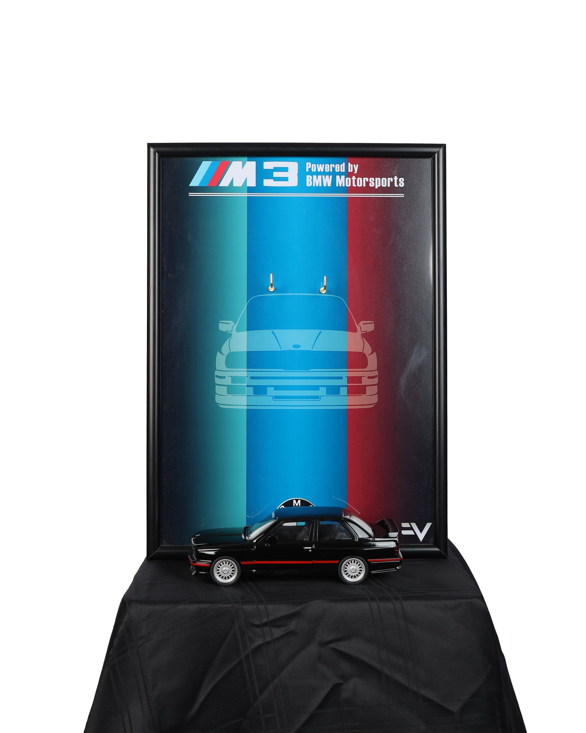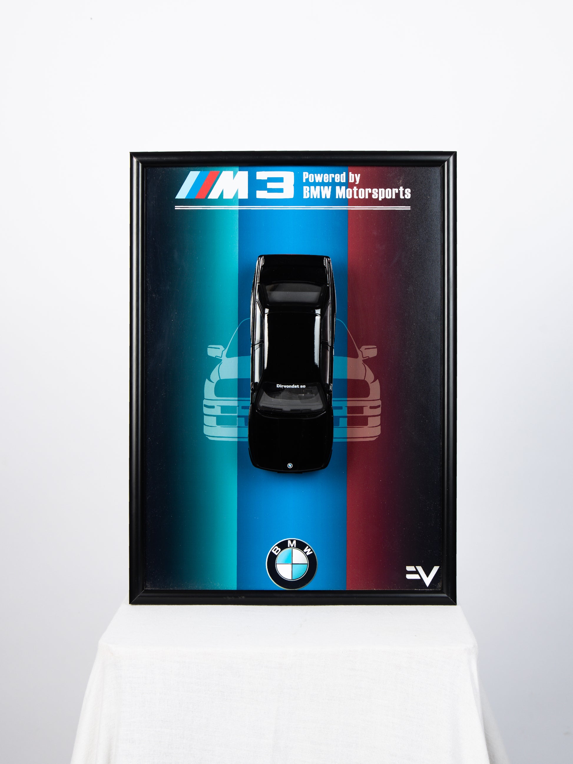 The BMW M3 E30 is the origin of M-performance, a motorsport-bred icon that redefined driving dynamics. This 1:24 scale model is showcased on a striking poster featuring BMW M’s signature tri-colour stripes, symbolizing its racing heritage. The minimalist yet bold illustration of the E30 front end highlights its aggressive stance and timeless design. Nestled in a premium frame with high-end packaging, this collector’s piece is a tribute to the car that started it all, a must for true BMW enthusiasts and purists.