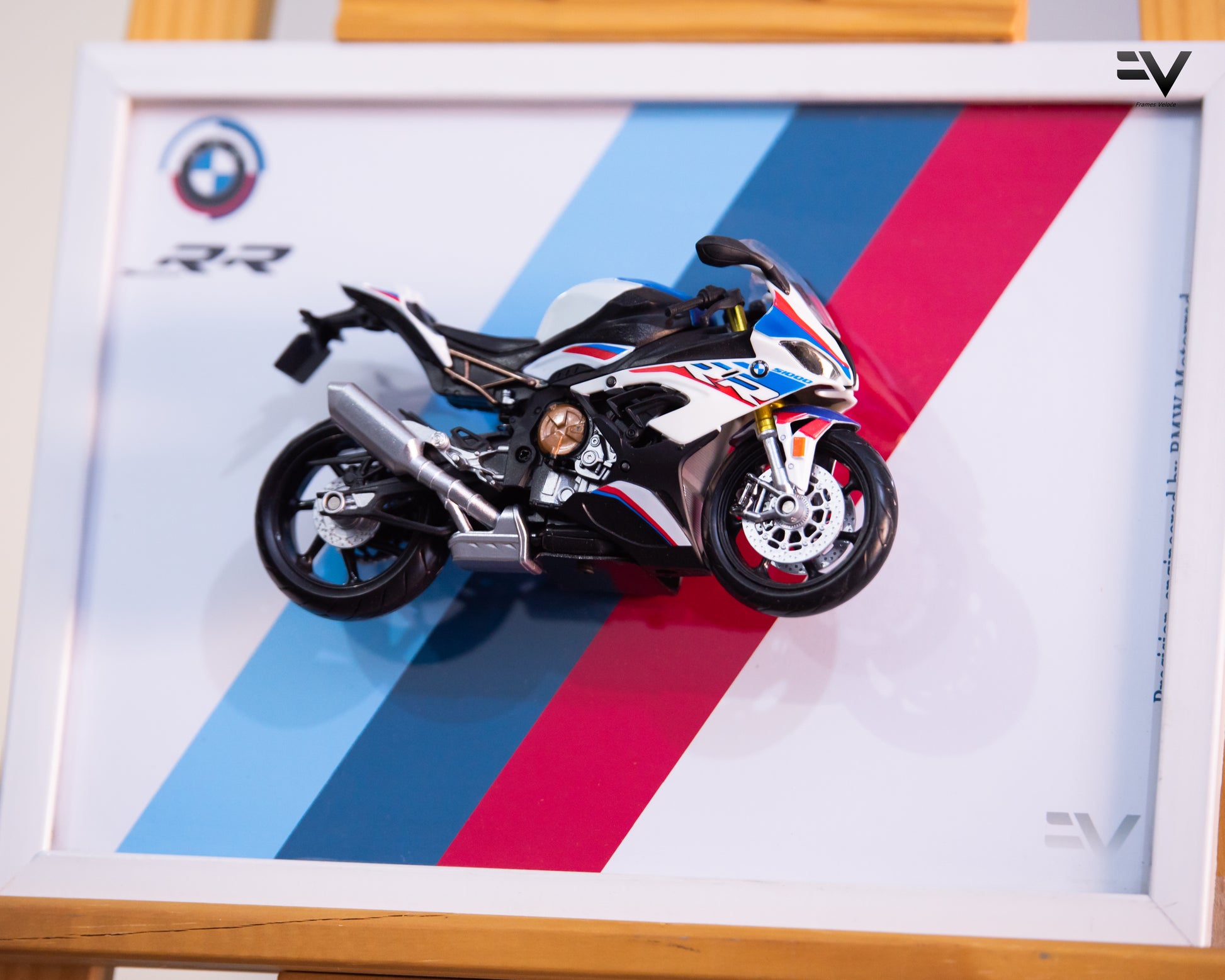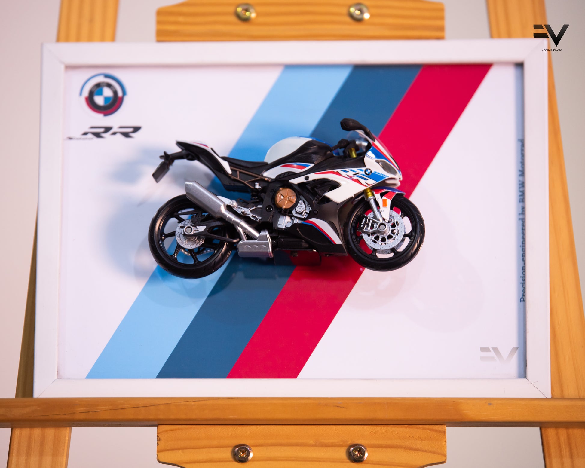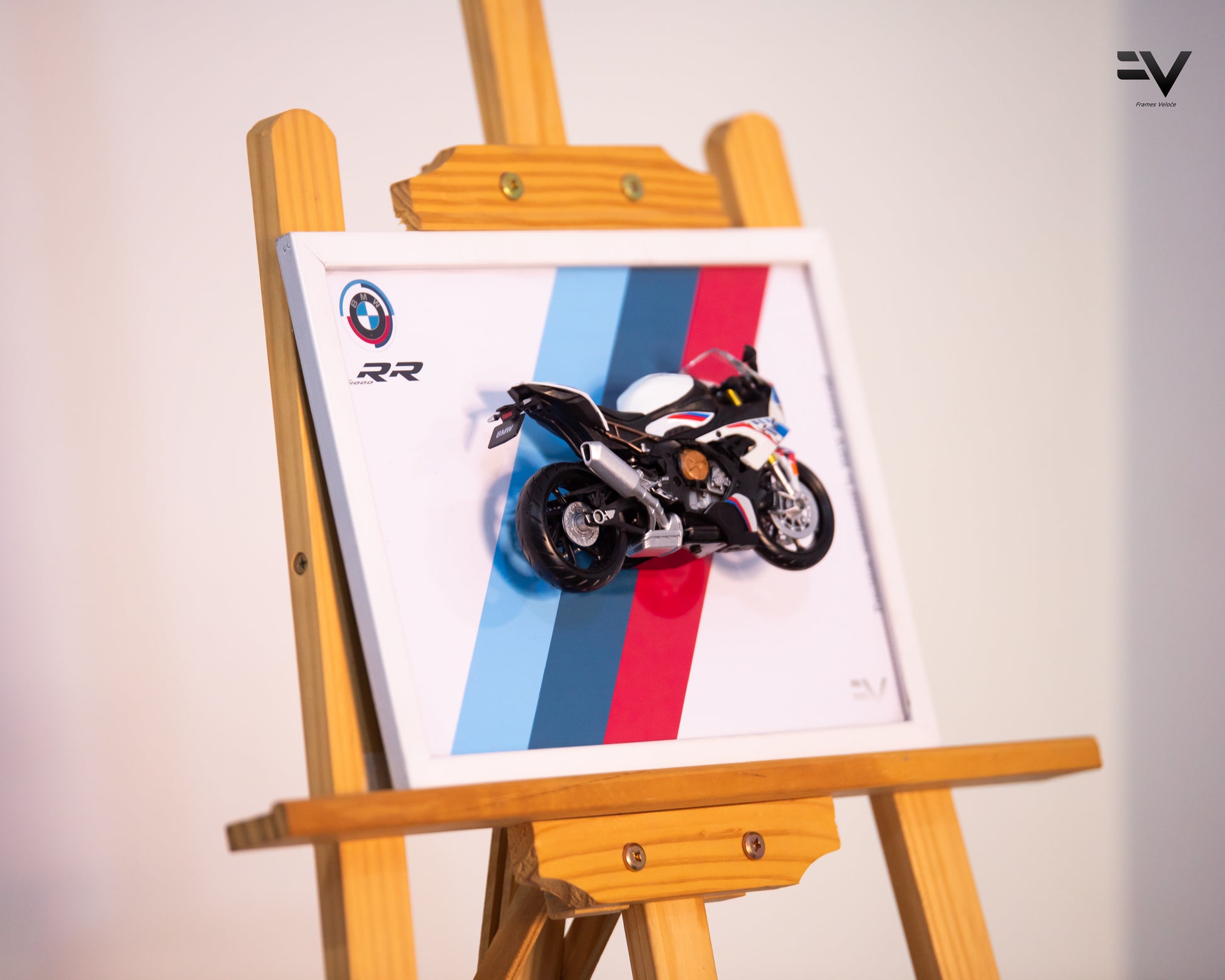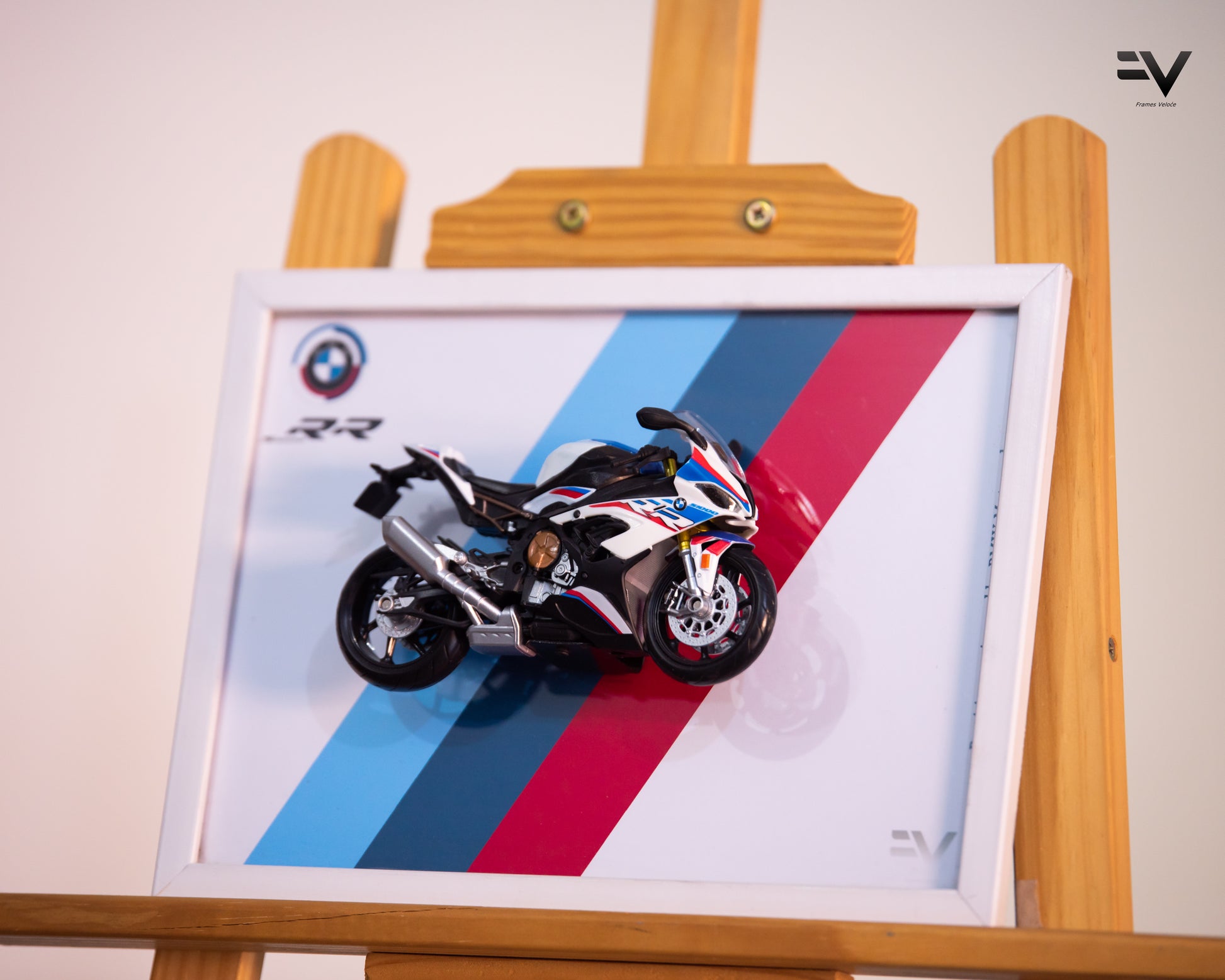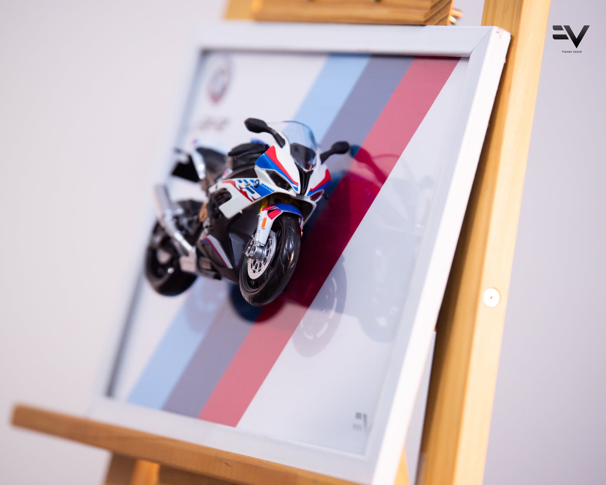 The backdrop features BMW’s legendary racing stripes—blue, violet, and red—set against a bold canvas that symbolizes speed, performance, and heritage. Together, the frame and model embody the balance of cutting-edge innovation and iconic motorsport DNA that define BMW Motorrad.