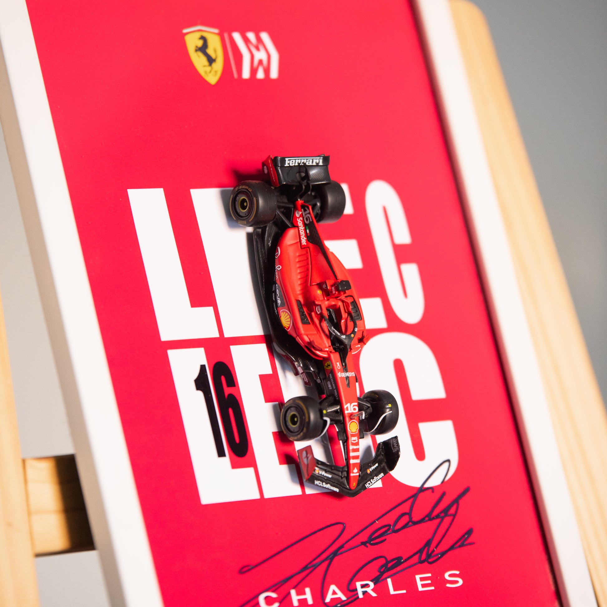 Set against a bold Ferrari red poster, it features Leclerc’s name, race number 16, signature, and the Prancing Horse emblem, a dynamic tribute to speed, precision, and passion.