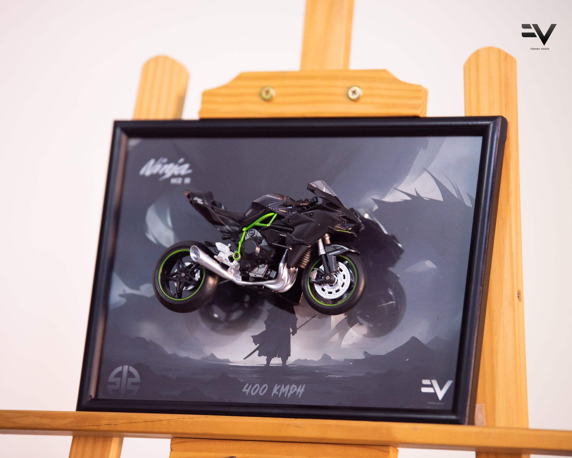 Displayed against a striking poster of a lone Ninja warrior, calm yet unyielding, facing a towering Lovecraftian dragon, the backdrop symbolizes resilience, precision, and unshakable spirit. The imagery fuses Kawasaki’s legendary racing DNA with mythic storytelling, making the piece as much art as machine.