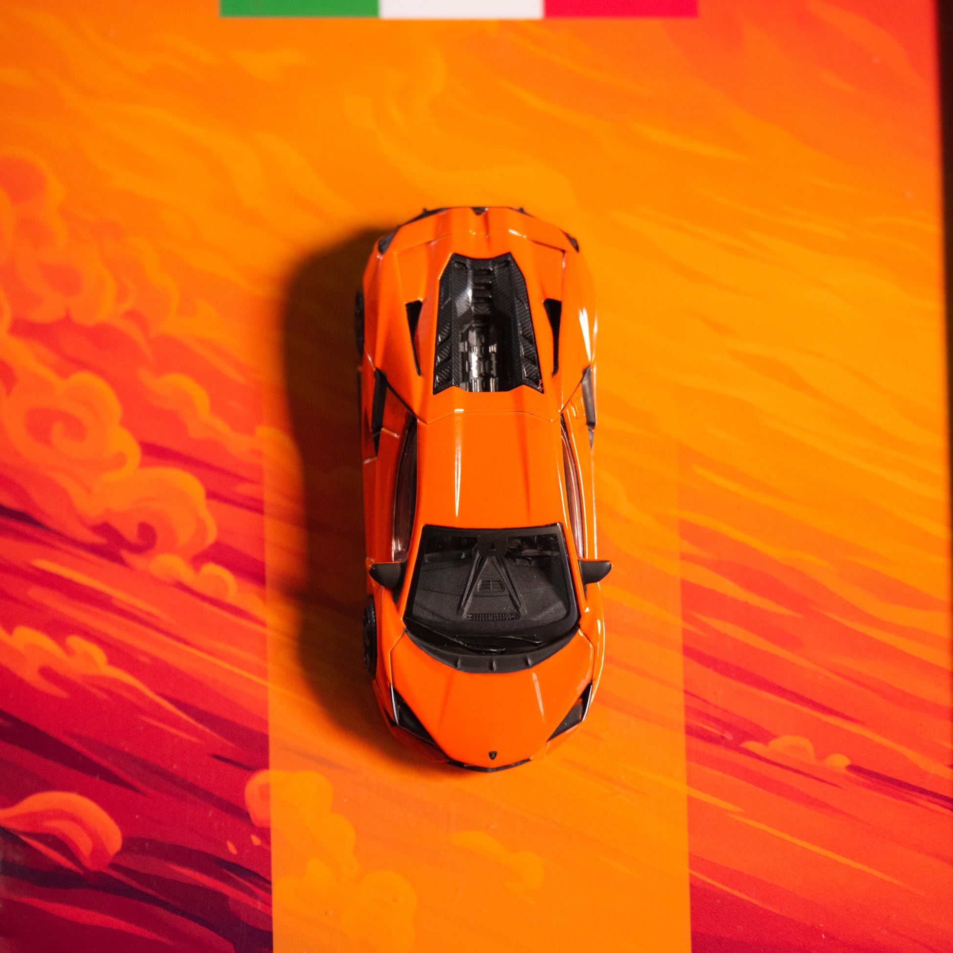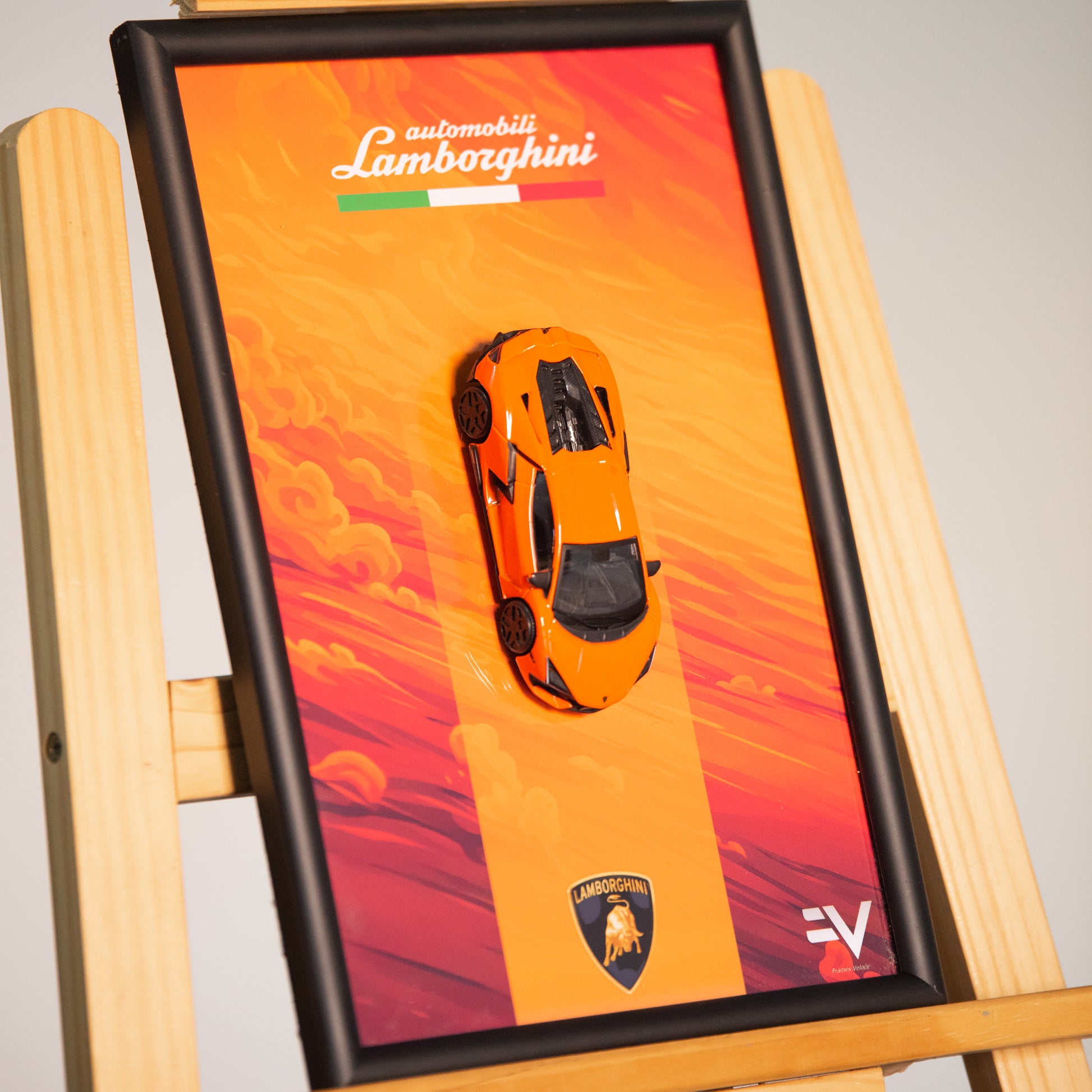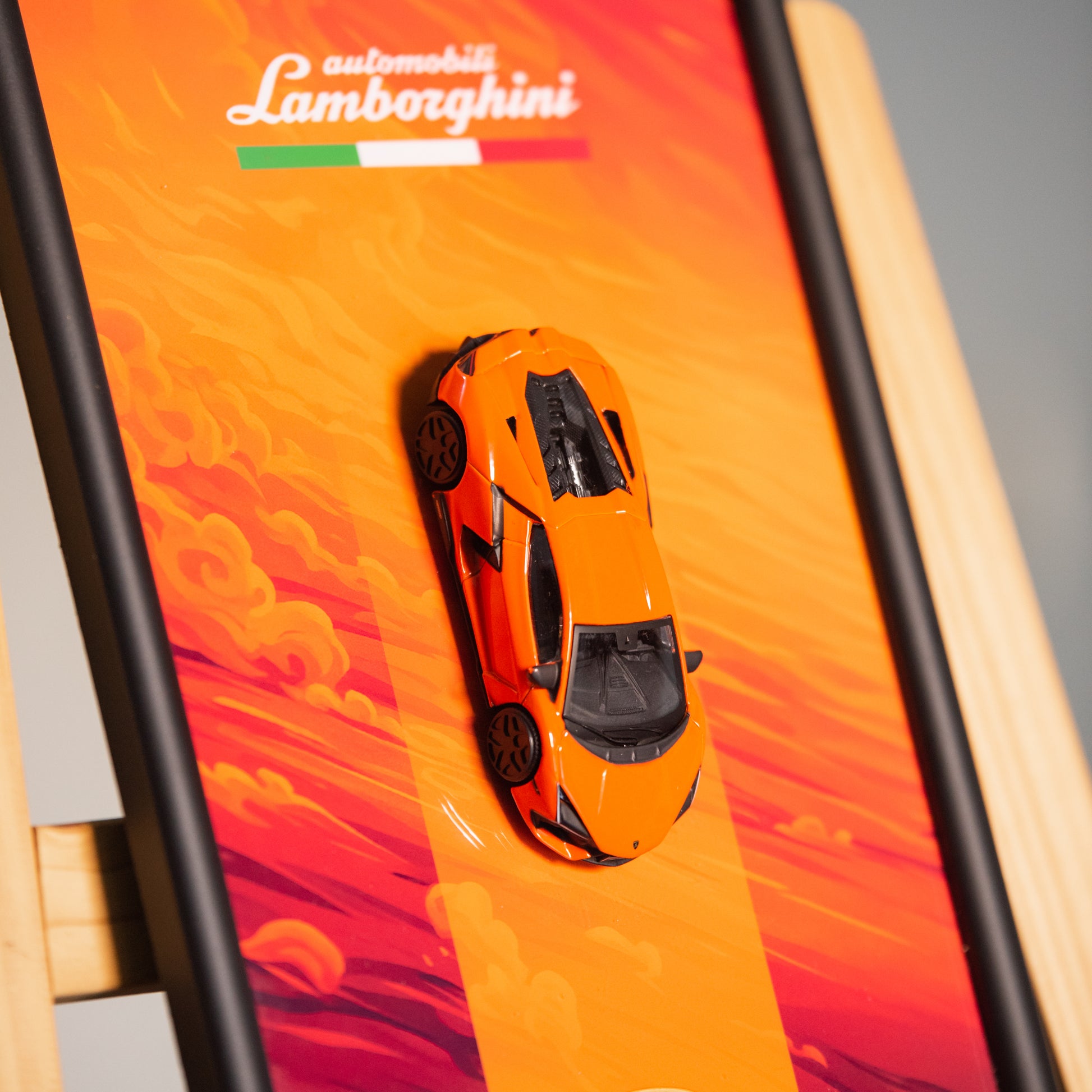 Mounted on a fiery orange-red poster with the "automobili Lamborghini" script and Raging Bull emblem, the backdrop reflects the car’s explosive energy and bold identity.